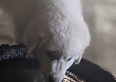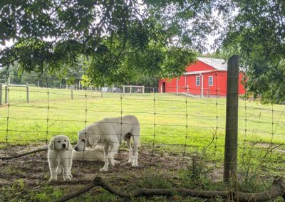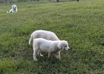 The Maremma can guard a variety of animals. At our farm they guard goats, pigs, chickens, turkeys, cows, and pigs. They even get along exceedingly well with our many barn cats. Our Maremmas have been exceptionally proficient and have protected our flocks and herds for years now with zero predator losses. They have kept everyone safe from 4-legged predators, primarily coyotes, and we are sure they have given potential 2-legged “predators” reason to pause as they approach our remote fields.
